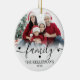 Family Christmas Photo Ornament. Celebrate the joy of the season with this elegant, custom ornament featuring your favorite photos. The front displays the word “family” in flowing script across the top, with your family name below in a timeless serif font for a personal touch. The back includes space for a second photo, perfect for another favorite memory or festive moment. Soft white ombre details and customizable font and accent colors make this keepsake ornament a warm, classic addition to your holiday decor.