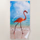 Freuen Sie sich auf Komfort am Strand oder am Pool und lassen Sie sich von diesem farbenfrohen Strandtuch cool und abkühlen. Lassen Sie sich im Sand von diesem schönen, zeitgenössischen Aquarellbild mit rosa Flamingo, das an einem tropischen Strand parkt, mit blauen und türkisfarbenen Ozeanen, Surfen im Hintergrund und einem hellen Sommerhimmel. Mit der Option, um personalisieren oder mit Namen oder Text Ihrer Wahl. Verziertes, skurriles und trendiges Design mit einer Vielfalt an unterhaltsamen, eleganten und trendigen Dekorationsakzenten und Strandelementen.