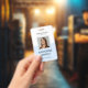 Modern square-shaped personalized employee photo ID name badge with a custom QR code. Simple, sleek light blue Identification name and title photograph badges. Security photo tag.