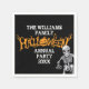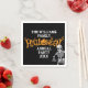 Coole Papierserviette aus Halloween-Party, die mit einem gruseligen Skelett, das über einem schwarzen und orangefarbenen Text hängt, und einer phantastischen Kürbislaterne versehen ist. Passen Sie diese Dekoration mit Ihren großen Bash-Informationen für alle Ihre Gäste an.
