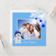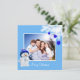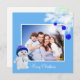 Eigene Familie, weiße Pine mit blauen Weihnachtsbällen und niedlichem Schneemann auf himmelblauer Weihnachtsgrüße.