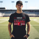 Custom Football Name and Player Number T - Shirt for Vater - Shown in Black Design for football dads and fans bietet eine benutzerdefinierte Schrift mit Helm, Fußball nähen Details, Streifen und benutzerdefinierten Text, der mit einem Mannschaftsnamen und Spielernummer personalisiert werden kann. Die Farben Rot und Weiß können geändert werden.