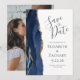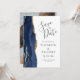 Diese elegante, moderne Save the Date-Karte verfügt über eine marineblau-blaue Aquarellgrenze mit vergoldetem Imitat-Glitzer. Der anpassbare Text ist kohlegrau auf einem weißen Hintergrund. Ersetzen Sie das Beispielbild auf der Rückseite einfach durch ein Foto der zukünftigen Braut und des Bräutigams.
