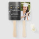Helfen Sie Ihren Abschluss, während der Zeremonie oder Party cool behalten mit diesen maßgeschneiderten Foto Abschluss-Handventilatoren, mit den Worten "Herzlichen Glückwunsch zu unserem Graduate" in weißem Text auf einem kohlegrauen Imitat gebürstete Metall Hintergrund. Das Wort "Graduate" erscheint in einem anmutigen Skript im Handschriftenstil. Ein paar goldene Imitate Glitzer Mörtel-Kappen und eine Streuung von Goldkonfetti schmücken den oberen Teil des Etiketts. Personalisieren Sie eine Seite mit dem Namen, der Schule und dem Jahr des Abschlusses Ihres Abschlusses. Ersetzen Sie das Beispielbild auf der anderen Seite einfach durch ein Foto Ihres Abschlusses.