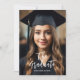 Benutzerdefiniertes ganzseitiges Foto eines Absolventen mit weißer Schrift Typografie. Individuell gestaltbare Abschluss-Feier Einladung in Schwarz und Gold Typografie.