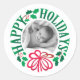 Ein Happy Holidays Kranz der Typografie rund um Ihr personalisiertes Foto rund Aufkleber. Teilen Sie Ihre Freude an Ihrem neuen Baby oder Enkelbaby oder vielleicht einem neuen Haustier. Alles in festlichen Rottönen und Grüntönen. Ideal für die Versiegelung all dieser Urlaubshüllungen oder Geschenkverpackungen.