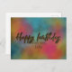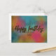 Modernes und trendiges personalisiertes Geburtstagskartendesign mit dem Text "Glücklicher Geburtstag" in Imitate goldenes Glitzer-Drehbuch auf einem farbenfrohen Aquarellhintergrund.