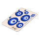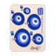 Original hand drawn illustration of a warm beige wall with display of hanged traditional glass plates in colors and shape of evil eye ornament with lizzard crawling upon the wall. Travel destination design in loose hand drawn style.
