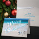 Gefaltete Weihnachtskarten mit gekleidetem Text für Ihren individuellen Gruß auf der Vorderseite. Zwei Seesterne, mit Ornamenten aufgehängt, zieren die Ecke über glattem, tropischem Sand und Wellen am Ufer. Im Inneren, mit einem Gruß und Signatur auch gedruckt auf einem Strand Sand Bild.
