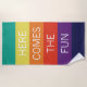 Helles, helles Strandtuch mit hellgrünen, sonnengelben, lebhaften, orangefarbenen, fett roten, lila und dunkelblauen Streifen Muster und Spaß HIER KOMMT DER SUN Zitat. Feiern Sie die Sommerzeit... Strandzeit, Poolzeit, Spaß!