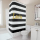 Passen Sie die goldene Schrift des Imitats auf diesem schwarz-weiß gestreiften Duschvorhang mit Ihrem Wunschtext an.