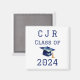 Personalisieren Sie die drei Initialen und das Abschluss Jahr in dieser Klasse des Magneten 2024. Blauer Text, weißer Hintergrund und blaues Graduierungshülse mit Goldtassel. Diese Magnete eignen sich hervorragend für ein maßgeschneidertes Abschluss-Geschenk und für Gastgeschenke, die den Absolventen ehren.