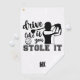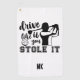 Das golffarbene Handtuch ist personalisiert mit dem Monogramm/den Initialen. Im Text steht: "Fahre es so, wie du es gestohlen hast."