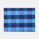 Refresh your space with this cool and contemporary "Blue Mosaic" pattern. The artwork features a grid of squares in a monochromatic palette of navy, royal blue, and cyan, creating a look reminiscent of classic swimming pool tiles, retro 8-bit video game graphics, or a modern patchwork quilt.