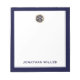 Ein berufliches Notizblock mit minimalistischem Luxus-Design in Marineblau und Weiß. Oben goldfarbenes metallisches Emblem mit Monogramm-Namen in klassischer Typografie auf einem schlichten, weißen Hintergrund, gerahmt durch eine Marinebrücke.
