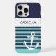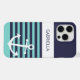 Einfaches, zeitgenössisches Schiff-Anker auf einem klassischen und schicken marineblauen Blau und hellen sommerlichen türkisfarbenen Streifen Muster. Mit Raum zum Personalisieren oder Anpassen mit einem Namen, Initialen oder Monogramm Ihrer Wahl auf einem weißen Hintergrund. Schönes, modernes und cooles Cover für den Trend-geschickten und kunstliebenden angesagten Trendsetter, künstlerischer Motif-Liebhaber, der will, ihr Handy vor Staub und Schmutz, Abnutzung und Tränen zu schützen. Dieses Design ist erhältlich in Apple iPhone 6, 7, und 8 Plus, 10 oder X, XR, XS, 11, 12, 13 Mini, 14, 15 Plus, und Pro Max Handy Hüllen. Zeigen Sie Ihren persönlichen Stil, sehen Sie in der Mode und fühlen Sie sich stilvoll mit einem einzigartigen Design auf einem mobilen Zubehör Ihrer Wahl.