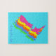 Neuseeländisches Puzzle in lebhaften, hellen, fluoreszierenden Farben Blau, Gelb, Rosa, Grün und Gelb. Dieses Kiwi-Puzzle hat unten Platz, um Ihren eigenen Text hinzuzufügen. Das wäre ein wunderbares Geschenk!