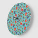 Eine coole, runde Wall-Uhr mit einem Muster niedlicher Eule in Rot, Blau, Grün auf türkisblauem Hintergrund, die Sie mit der Schaltfläche Bearbeiten ganz einfach ändern können. Das Eukalyptmuster stammt aus einer handbemalten, von Judy Adamson entworfenen Collage.