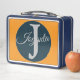 Modern custom orange Light ocean blue Monogram metal lunch box.