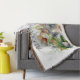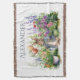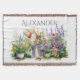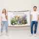 Das Design kann personalisiert werden, indem man einen Namen hinzufügt, es zu einem nachdenklichen und einzigartigen Geschenk macht oder bewahrt, das sich wirklich besonders anfühlt. Peter das Kaninchen in seiner blauen Jacke mit farbigen Ballons in seinem Blumengarten mit einem weißen Schlammzaun