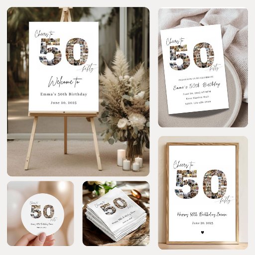 Celebrate fifty years of memories with this elegant custom photo collage 50th birthday poster gift. Featuring a large “50” filled with personal photos and modern handwritten typography, this personalized print makes a meaningful birthday gift and stylish party décor. Perfect as a framed keepsake, wall art, or memory display—fully customizable with name and date. An unforgettable milestone birthday gift on Zazzle.
