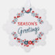 Einzigartige, klassische, trendige, hübsche und dekorative Corporate Holiday-Ornament-Karte. Niedlich Happy Holidays Grußtext und Raum zum Anpassen oder Personalisieren mit einer Nachricht Ihrer Wahl auf der Rückseite der Karte. Gerahmt durch einen roten und aquamarin blauen Volkskarvogel und blumengeschmückte Karikaturen auf klassisch weißem Hintergrund.