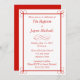 Diese maßgeschneiderte rote Einladung ist der perfekte Weg, um Ihre Freunde und Familie zu der Taufe Ihres Kindes einzuladen. Diese personalisierte Einladung enthält einen eleganten Scrollrand und roten Text. Sie können das im Lieferumfang enthaltene Taufen Einladungsbeispiel verwenden oder den Text für jede andere Veranstaltung, wie z.B. Abschluss, Hochzeit oder Geburtstagsparty, anpassen. Sie können Schriftart, Textfarbe und Wortlaut von der Produktbestellseite leicht ändern.