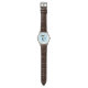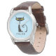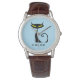 Dieses personalisierte, klassisch braune Lederuhr-Design zeichnet sich durch ein Retro Mitte des Jahrhunderts modernes "atomares" schwarzes Katzen mit großen gelben Augen und einem lockigen Schwanz aus. Sie können die Rechtschreibung, den Stil, die Farbe und die Größe des Schriftartes mit der Schaltfläche Zazzle Personalize leicht ändern.