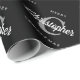 Dieses maßgeschneiderte Verpackungspapier bringt eine persönliche Touch zu Ihren Weihnachtsgeschenken. Es zeigt ein sich wiederholendes Namensmuster in einem weißen Retro-Script-Schriftart über einem grauen Monogramm-Initial, umgeben von den Worten "Frohe Weihnachten" auf einem schwarzen Hintergrund.