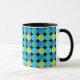 Eine schicke, schwarz-weiße Ringer-Tasse mit einem kühnen Blue Moons 'grid'-Muster in Türkis, Neon Green und Aquamarin auf einem schwarzen Hintergrund, die Sie ändern können, wenn Sie wollen - Blau oder Weiß auch gut aussehen. Teil der Posh & Painterly 'Blue Moons' Kollektion.