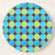 Ein auffälliger, runder Sandstone Untersetzer mit einem Gittermuster aus Türkis, Dazzling Blau, Smaragd und Neon Green Circles auf einem schwarzen Hintergrund, den Sie leicht ändern können - Royal Blue und White sehen beide gut aus. Teil der Posh & Painterly 'Blue Moons' Kollektion, basierend auf einer handbemalten Papiercollage von Judy Adamson.