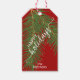 Die zeitgenössische Weihnachtszeit-Geschenkmarke mit Happy Holidays Zitat in schlichter, minimalistischer, weißer Typografie-Schriftart auf Kiefernnadeln auf dunkelrotem Hintergrund. Mit der Option, um mit Familie oder Firmennamen oder kurzen Text Ihrer Wahl.