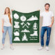 Fügen Sie einfach Ihren Lieblingscampingplatz und den Staat hinzu, in dem Sie Ihre eigene Souvenir-Camping-Fleece erstellen können, werfen Sie Blanet oder fügen Sie einen Familiennamen oder einen anderen Text hinzu, um eine individuelle Dekoration für Ihre Ferienhäuser zu schaffen, die eine Collage von Camping-Szenen und Outdoor-Ausrüstung in Weiß vor einem Jäger-grünen Hintergrund enthält. Ein cooles Geschenk für Camper und alle, die die große Freizeit Liebe. Es gibt Abbildungen von Bergen, ein Zelt, ein Lagerfeuer, eine Laterne, Wanderstiefel und vieles mehr.