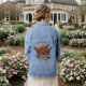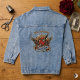 Make a bold statement with this customizable denim jacket featuring classic traditional tattoo art. The edgy design showcases a vibrant, fiery red heart pierced by a dagger, perfectly framed by angel wings, blooming roses, and a vintage ribbon banner. Ideal for alternative weddings, edgy anniversaries, motorcycle enthusiasts, or matching couple apparel. Easily personalize the top text and the bottom date banner to commemorate your special day, creating a unique "till death do us part" keepsake you can wear anywhere.