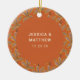 Fügen Sie Ihren Feierlichkeiten ein Retro-Ambiente mit diesem zauberhaften Keramik-Ornament mit tropischen Palmen in verbrannter Orange hinzu, das auf Ihre Hochzeitsdetails zugeschnitten ist. Ideal für Hochzeiten am Strand oder für Paare, die die Vintage tropische Ästhetik Liebe haben, ist dieses Ornament ein einzigartiger und bedeutsamer Sake. Ob für Ihren eigenen Baum oder für ein nachdenkliches Geschenk für Neuvermählte, dieses Design vereint den entspannten, sonnigen Geist Ihres besonderen Tages auf unterhaltsame und stilvolle Weise.