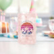 Ein schönes, individuelles Strandhaus kann Gläser mit einem tropischen Sonnenuntergang für eine Insel Zuhause. Niedliche personalisierte Brille mit hübschem Rosa und Blau hinter niedlichen Palmen.