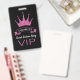 Elegantes und stilvolles Abzeichen zur Feier eines 16 . Geburtstag Geburtstagsfestes. mit Monogramm mit dem Namen der Geburtstagskinder. Bieten Sie Ihren Gästen VIP-Zugang. Schöne Imitat rosa Glitzer Krone und moderne Typografie Stil. Klassisches Schwarz, Weiß und Rosa Thema.