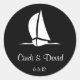 Rundaufkleber in Schwarz/Weiß mit einem Segelbootdruck. Passen Sie diesen Aufkleber an, indem Sie den Text in Ihren Namen und Ihr Datum ändern und sogar Ihre Lieblingsfarben auswählen und ändern.