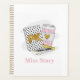 Dieser Vorschullehrer-Planer behalte an einem Ort Ihre Unterrichtspläne. Das Muster hat ein weißes Notizbuch mit schwarzen Polka-Punkten, einem goldenen PK, Herzkaffee, Lineal, Stift und Bleistift. Dieses weiße Notebook mit schwarzen Polka-Punkte-Design kann auf anderen Artikeln in meinem Shop gefunden werden, PageCreativeDesigns.