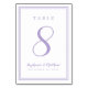A template for any number, this simple, minimalist, and elegant wedding table number design features a contemporary double‑frame border in soft lavender on a crisp white background. The chic layout provides timeless yet modern sophistication. Personalize the table number, couple’s names, and wedding date in matching lavender lettering and script. The back of the card mirrors the front for a cohesive presentation. Easily customize and order an individual card for every table at your celebration.