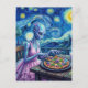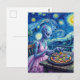 Cute Alien in Pink Dress Eats Pizza Faux Van Gogh Postkarte