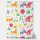 Tapete für ein Kinderzimmer oder ein Kinderzimmer mit Abbildungen von rosa Elefanten, Zebras, orangefarbenen Giraffen und Leoparden und grünen, gelben tropischen Blättern.