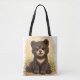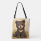 This cute baby bear tote bag features an adorable fluffy bear cub with big sparkling eyes and a happy expression. Surrounded by soft floral elements and warm tones, this kawaii animal design brings a cozy woodland vibe that feels both playful and heartwarming.