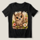 This adorable owl t-shirt features a cute baby owl with big expressive eyes in a close-up portrait surrounded by soft floral elements in a watercolor style.