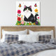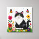 Cute Black and White Cat, Flowers and Butterflies Leinwanddruck
