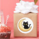 This cute black cat sticker features an adorable cartoon cat sitting peacefully on a glowing crescent moon.
