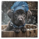 Fun and cute, a little black labrador puppy dog with a bathing hat on having a spa day in a bath full of bubbles. A fun housewarming gift, great decor for a bathroom.