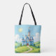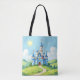 Cute blue and white castle with red flags on a bright summer day. This beautiful whimsical illustration with the sun, clouds, blue sky and green hill grass.