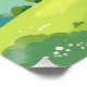 Cute blue and white castle with red flags on a bright summer day. This beautiful whimsical illustration with the sun, clouds, blue sky and green hill grass.