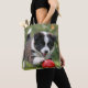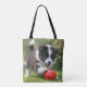 Calling all Border Collie lovers! This tote bag features a charming black and white puppy playing with a red ball. Perfect for everyday use, whether you're heading to work, school, or the shops. AI image prompt design by Susang6